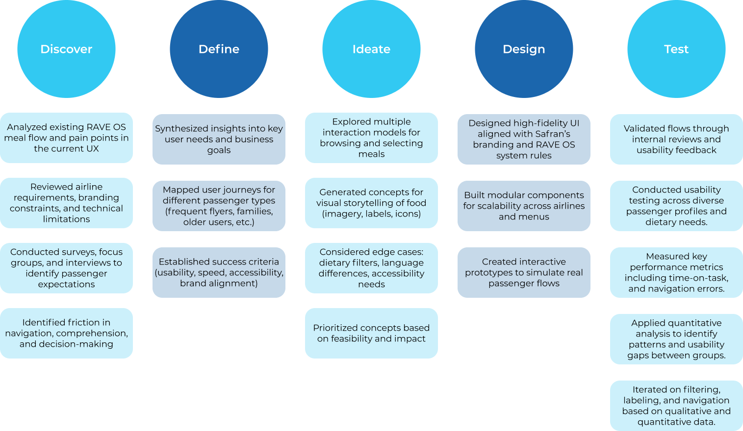 I mapped a user journey to understand how an ideal RAVE OS passenger experiences meal selection, highlighting moments of friction, uncertainty, and decision fatigue. These insights directly informed design changes aimed at improving accessibility and confidence in meal choice.
