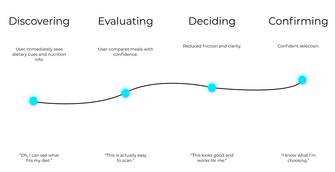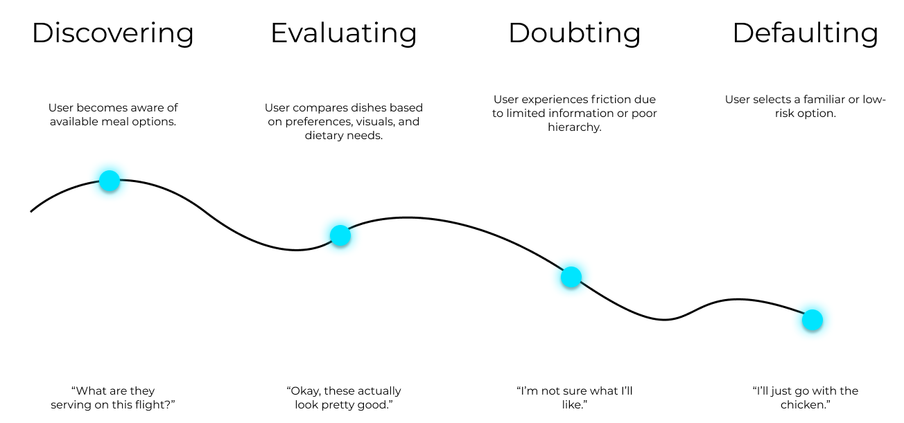 I mapped a new user journey to show how the redesigned meal menu replaces uncertainty with clarity, enabling RAVE OS passengers to make confident choices with ease.