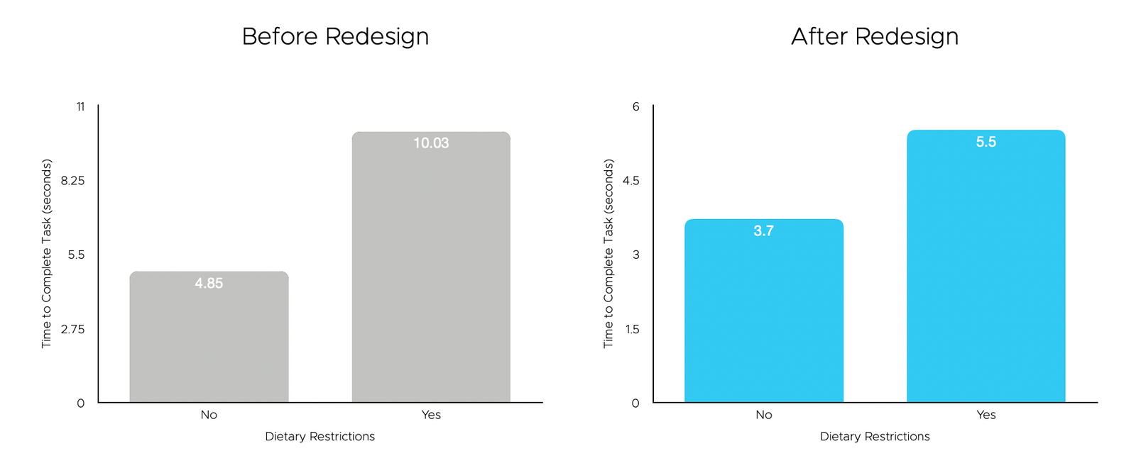 I re-ran usability testing with the updated design and compared performance across users with and without dietary restrictions. The results showed no meaningful difference in time-on-task between the two groups, indicating that the accessibility gap had been reduced.