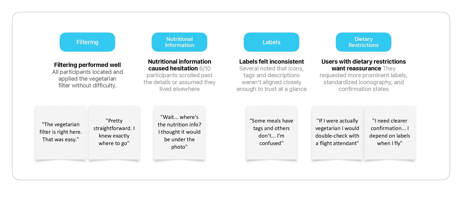 Once the meal-ordering feature was finalized, I conducted a usability test through UserTesting with 40 participants. Because our earlier research revealed that dietary information was a major decision factor, this round focused on whether the design was clear, intuitive, and accessible for passengers with dietary requirements.